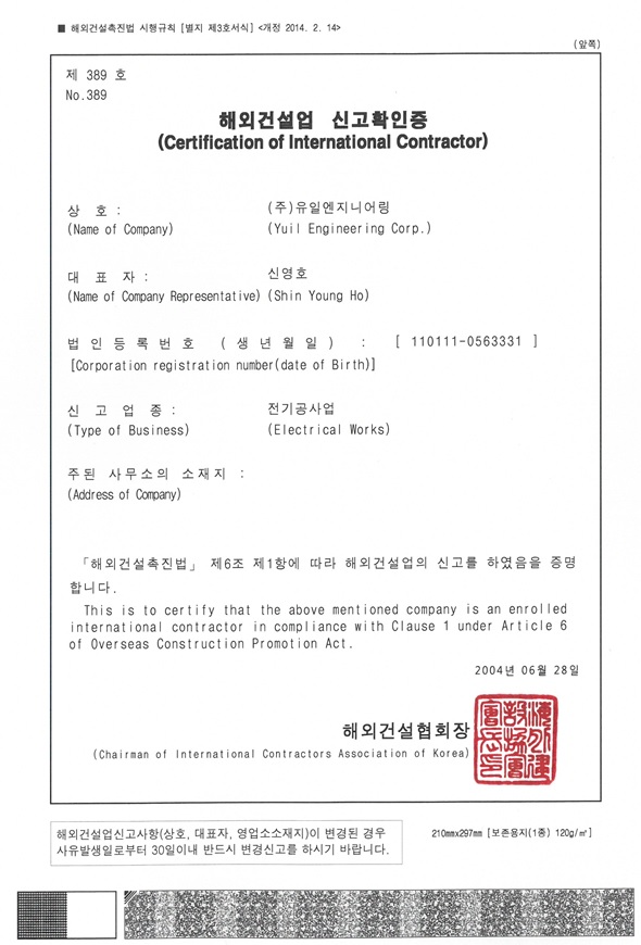 ÇØ¿Ü°Ç¼³¾÷ ½Å°íÈ®ÀÎÁõ Àü±â°ø»ç¾÷ Á¦389È£